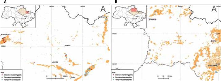 Temporary, permanent sample plots and intensive monitoring plots at the maps of Kharkiv (A) and Sumy (B) regions