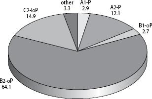 Analysis of the forest types of pine stands on the basis of the ‘Forests of Ukraine’ Database (stand-wise forest inventory) showed that the most common forest type in the Kharkiv region is fresh relatively poor oak-pine (B2-oP), which occupies 64.1% of the total forest area (Fig. 2).