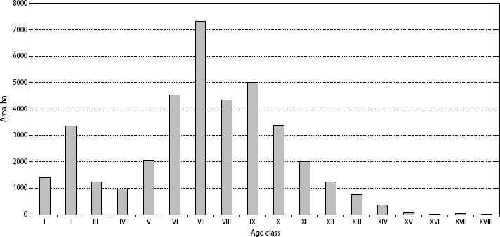 The pine stands of the VIII class of age (71–80 years) are predominant and occupy an area of 23.2%. By the age of maturity, the area of Scots pine stands decreases, and the share of overmatured stands is insignificant. The maximum growing stock is 371 m3ha-1 in the IX age class.