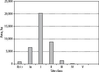 The distribution of pine stands area by site classes (Fig. 4), shows a small area of low-yielding stands and the predominance of stands of the first site class (51.6%).