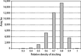 The distribution of pine stands by the relative density of stocking shows the predominance of stands with a value of 0.8 and relatively small areas of low-density stands, (Fig. 5) which indicates the proper forest management by enterprises of the Kharkiv region.