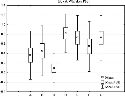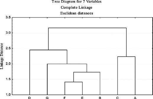 Dendrogram of the influence of the peculiarities of social status on the choice of forestry profession: A – living in a village; B – residence in the city; C – living in the capital; D – living conditions in childhood; E – family participation in consumer activities; F – personal participation in fishing and others; G – personal participation in outdoor nature activities