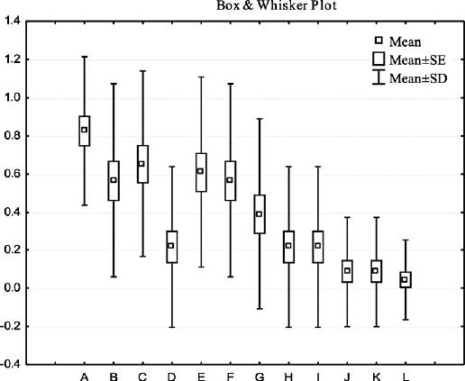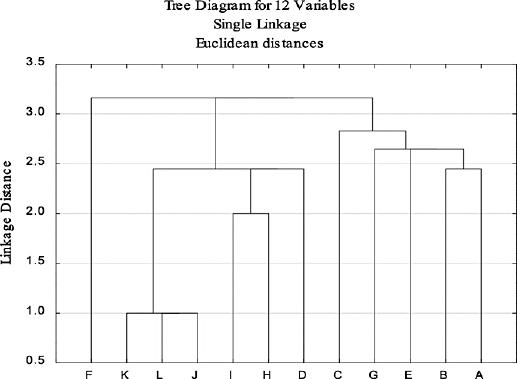 Dendrogram of the influence of 12 motivating factors on the choice of forestry profession: A – enjoyment of nature; B – enjoyment of outdoor recreation; C – pleasure of being outdoors; D – job satisfaction; E – care for the environment; F – personal interest; G – interest in forests; H – wages; I – prestige; J – influence of the media; K – influence of invited speakers; L – influence of the family