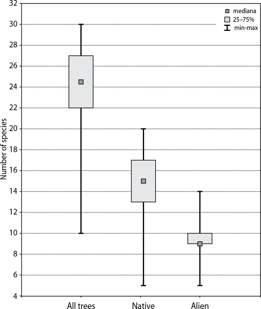 In the analysed stands of urban forests in Katowice, a total of 50 woody species were recorded, including 31 native species and 19 of alien origin (Tab. 2, 3). The vast majority were deciduous trees – 90.3% of the native trees and 100% of the alien trees. In individual forests, the stands ranged from 10 to 30 species, including 5–20 native species and 5–14 alien species (Fig. 1).