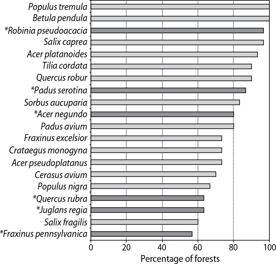 species occurring both on the edge and inside the forest (Acer negundo, Aesculus hippocastanum L., Fraxinus pennsylvanica Marshall, Juglans regia L., Padus serotina, Populus ‘Italica’, Quercus rubra and Robinia pseudoacacia).