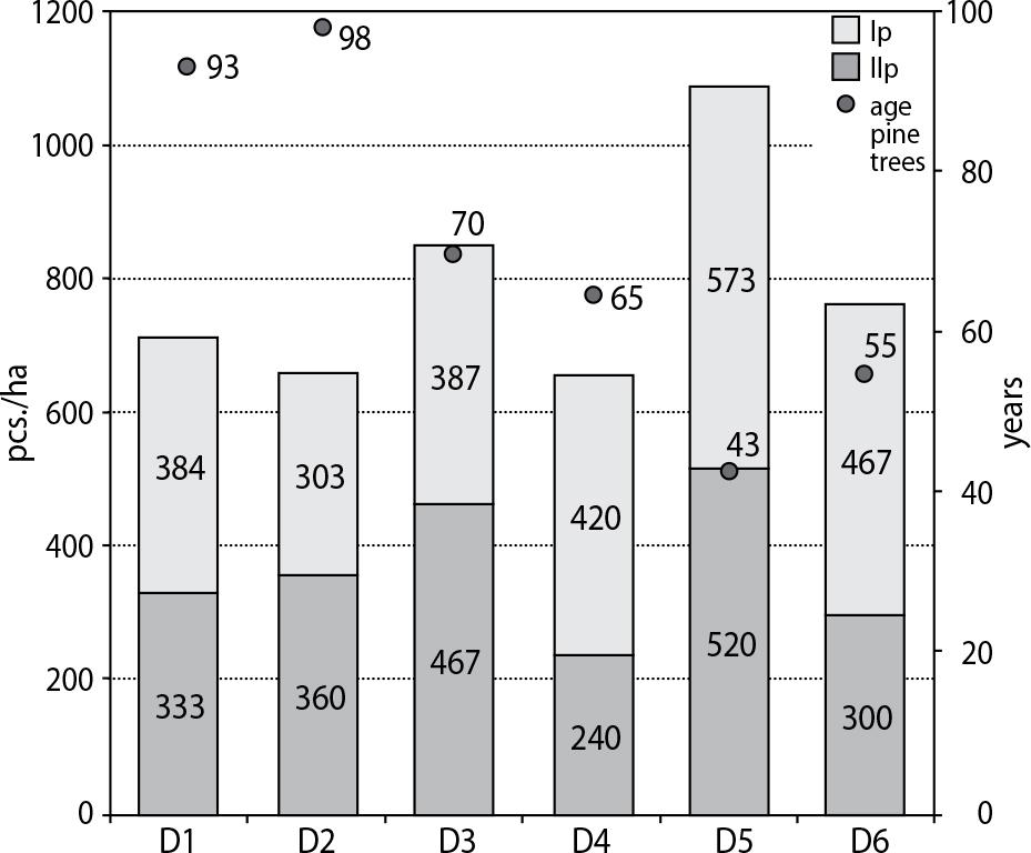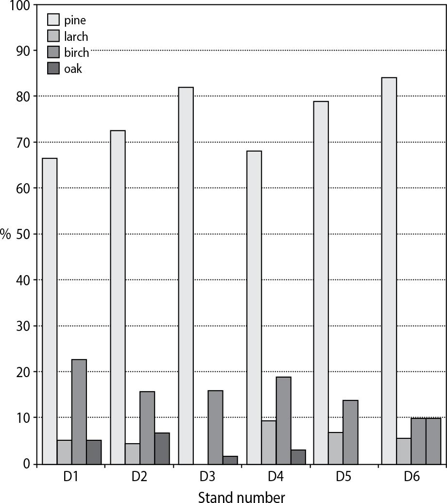 In each surveyed stand, the dominant species in the first storey was Scots pine (Pinus sylvestris L.), the proportion of which was ranged from nearly 67% to over 84%. The share of the admixture of the common birch (Betula pendula Roth) ranged from 10% to over 20%. The species composition of the studied stands also included larch (Larix decidua Mill.) and sessile oak (Quercus petraea (Matt.) Liebl.) (Fig. 1).