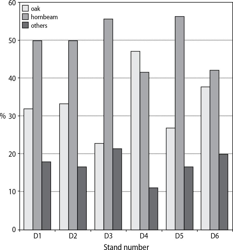 Species composition of the first storey of the studied stands in Paliwodzizna Forestry