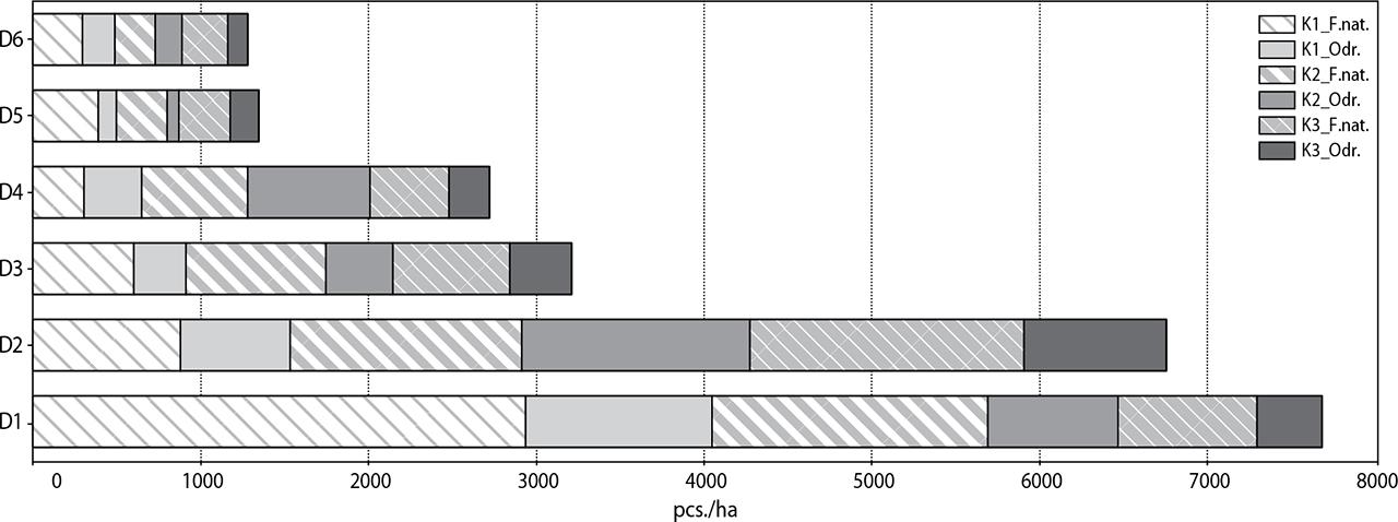 The density of black cherry was characterized by a high coefficient of variation. The average density of this species was more than 3,800 pcs/ha and fluctuated within wide limits (from 1,280 to 7,680 pcs/ha), that is, the stands statistically significantly differed in the density of black cherry (F=21.1249; p=0.0000) and also statistically significantly differed (F=6.9214; p=0.0002) in the proportion of forms offshoot stump sprout (F.ss.) and natural forms (F.nr.) (Fig. 4, Suppl. 1).