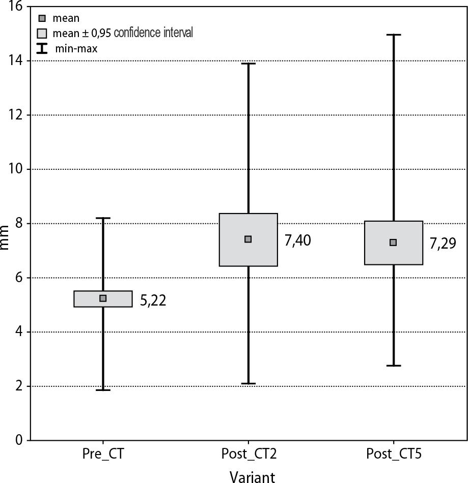In addition, black cherries were classified in terms of their origin into two groups: stump sprout (F.ss.) – specimens grown from stems after attempted mechanical control, and natural forms (F.nr.) – specimens without damage caused by its previous felling. For dendrochronological analyses, cherry tree specimens characterized by the largest trunk diameter (= 96.37 mm, SD = 25.0 mm) were selected. In each studied stand, 10 specimens of black cherry were selected (60 samples in total), from which discs were cut from the butt for dendrochronological analysis (caliper, measurement accuracy 0.1 mm). Based on the samples obtained, the age of the study sample (black cherry) and the average width of annual growth of black cherry rings before (CT) and after thinning were determined for two variants: 2 years (Post_CT2) and 5 years (Post_CT5) after the thinning. Using Statistica version 13. program, the obtained results were subjected to statistical analysis to determine the relationship between the width of annual growth of rings and the time of carrying out CT.