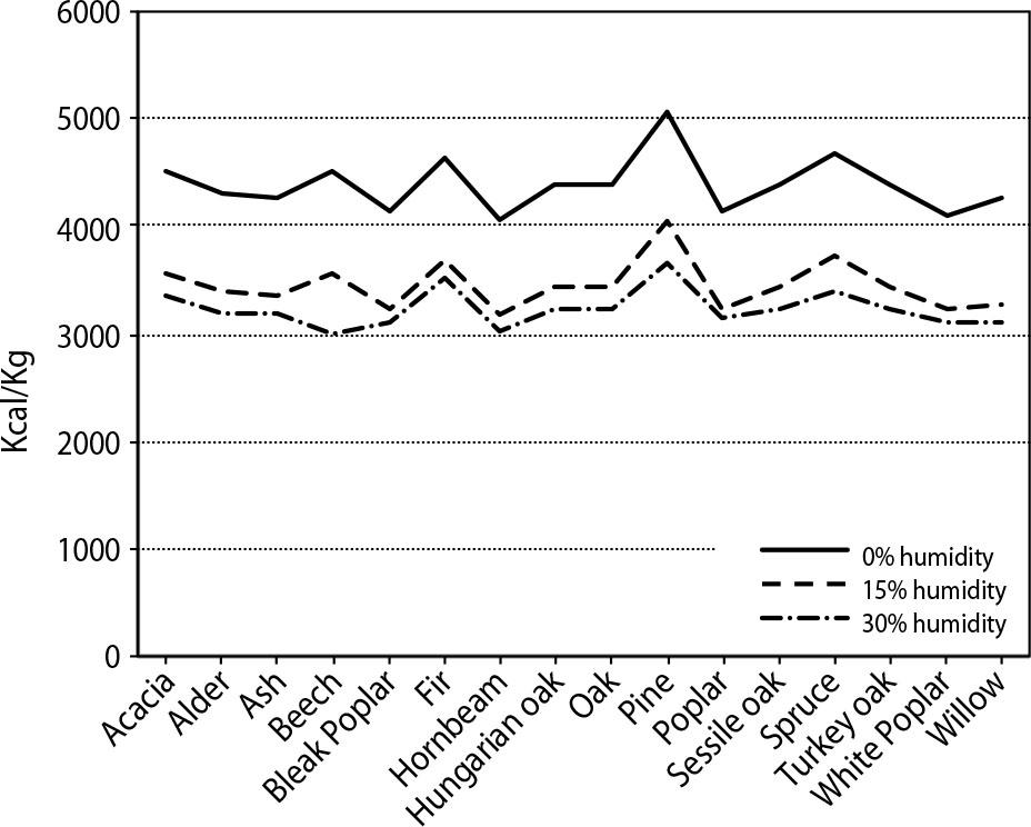 The productivity of wood in the forest reflects the maximum energy and carbon fixation capacity in the respective forest. Naturally, ecosystems modulate the structure of primary producers (green plants) so that they can maximize the fixation of incident radiant solar energy of the respective geographical area. The productivity values expressed as biomass per ha per year vary in a narrower range than standing crop biomass, reflecting the ability of forests to optimize the fixation of incident solar radiant energy. The caloric capacity varies depending on the humidity of the wood and its resin content (Tab. 2, Fig. 1). At a humidity of 30%, which represents the humidity of the wood when it is cut and extracted from the forest, for most tree species, the wood cannot be burned in an open source. The ideal humidity for work and for using wood as a fire source for heating homes is 15%. The highest calorific capacity of wood is at “0” humidity when all the energy accumulated through photosynthesis is released in the calorimetric bomb. In the case of wood with a humidity of 15% or 30%, a large part of the energy fixed by photosynthesis and released in the calorimetric bomb is consumed for the evaporation of water in the form of humidity (Fig. 1).