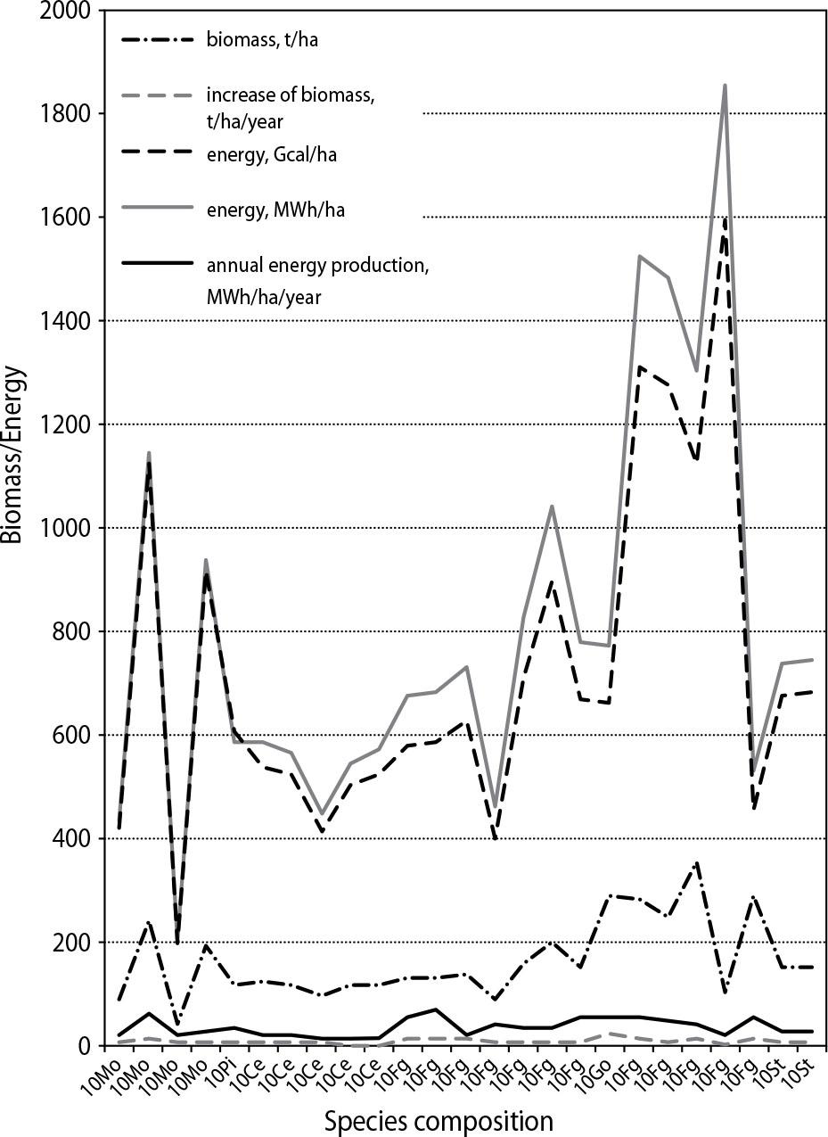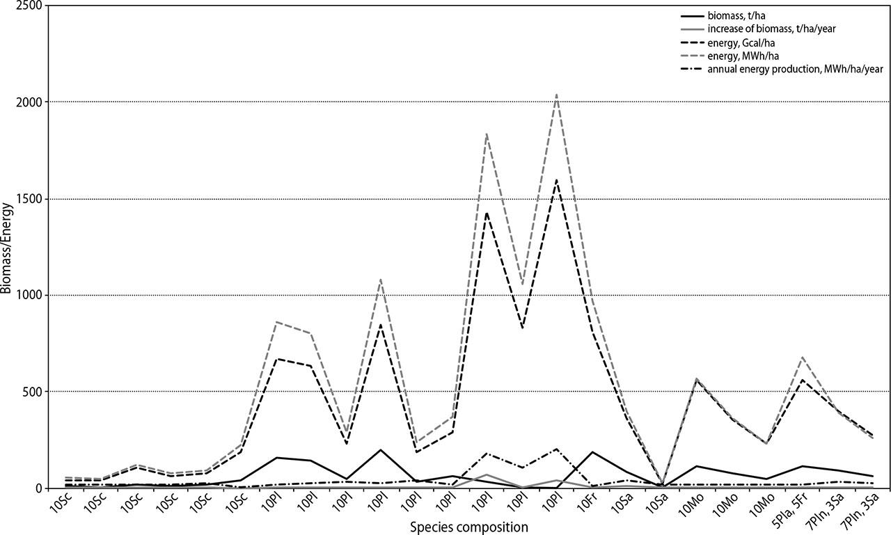 The structure of these types of forests is in close correlation with the way they function, and the result of the functions is biological production (biomass) and productivity (annual growth of biomass). The proportion of wood is very high (85%) in the biomass production of forest ecosystems, that is why the other components of the biomass were ignored. In a forest ecosystem, there is a direct correlation between the production of biomass as a standing crop and the ability to fix radiant solar energy; the more biomass the forest produces, the more energy efficient it is.