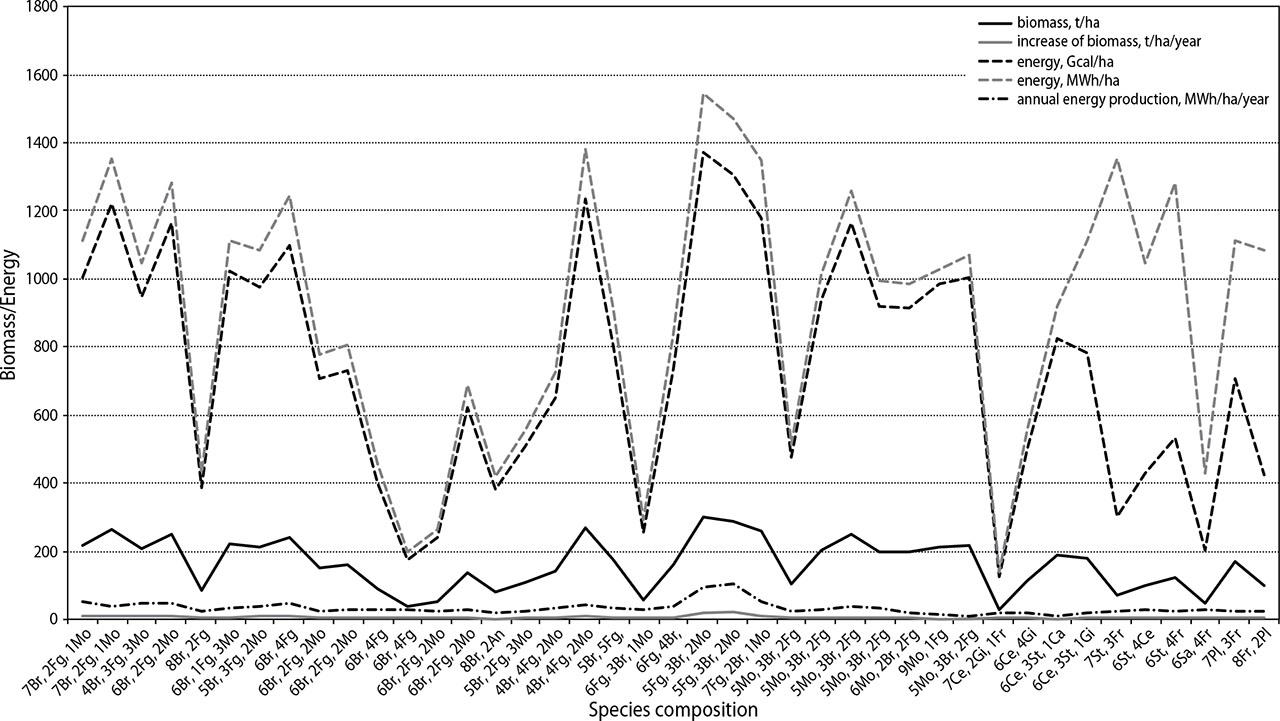 Biomass, annual increase of biomass, energy, and annual energy production of the mixed natural forests