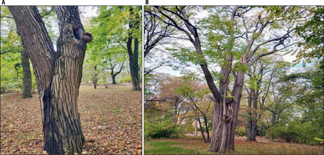 Cladrastis kentukea, Sophora japonica (Fig. 5A), Gleditsia triacanthos, and Gymnocladus dioica (Fig. 5B) had dry tops from 10% to 30% hollows. Robinia psevdoacacia L. had a crown that had dried up by 80%; there were many shoots of crown renewal, necrotic-cancerous diseases, hollows, and growths.