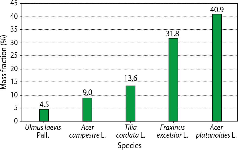 Our research allowed us to determine the species spectrum of trees affected by Viscum album. According to field observations in the study area, Viscum album infestation was detected on five tree species, including Ulmus laevis (4.5%), Acer campestre (9%), Tilia cordata (13.6%), Fraxinus excelsior (31.8%), and Acer platanoides (40.9%) (Fig. 9).