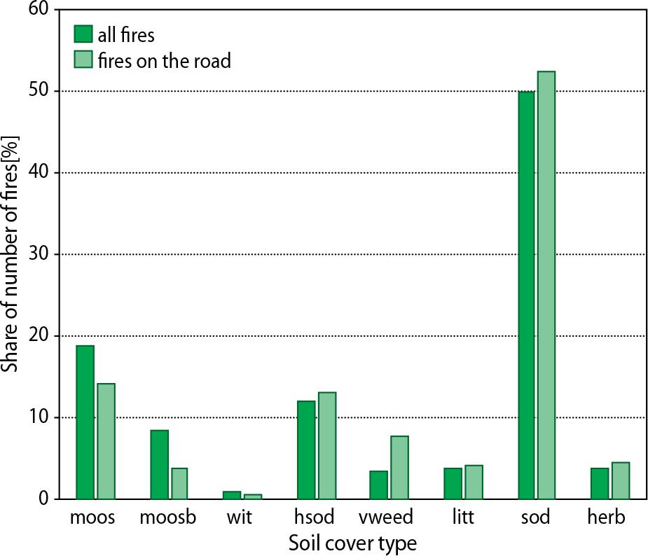 A certain correlation was recognisable in the investigated criterion of the type of ground cover (Fig. 2). In stands with a well-developed ground cover (sodded cover – SOD and heavily infested with weeds – VWEED), the proportion of fires near public roads was higher compared to all forests. In stands where the ground cover layer consisted only of mosses and blueberries (moss cover – MOSS and moss blueberry cover – MOOSB), the proportion of fires near public roads was lower.