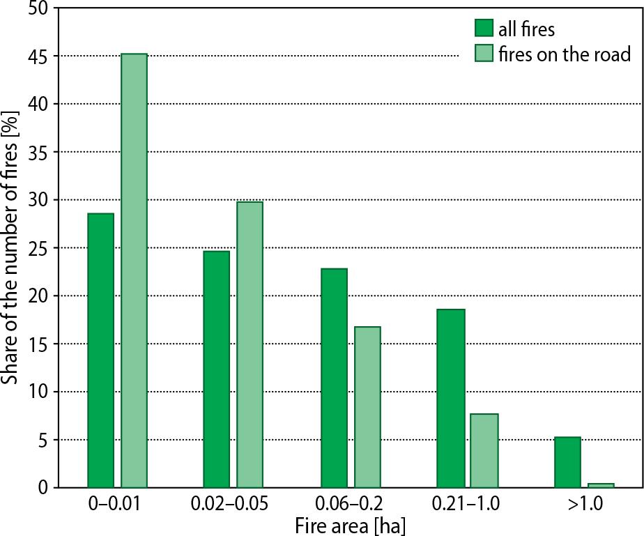 The next analysis concerned the occurrence of fires in relation to the size of the burnt area (Fig. 3). For fires with an area smaller than 0.2 ha, the proportion of those that occurred on public roads was greater than the proportion of all forest fires. The situation was reversed for fires with an area of more than 0.2 ha: they were significantly more numerous in all forests than on public roads.