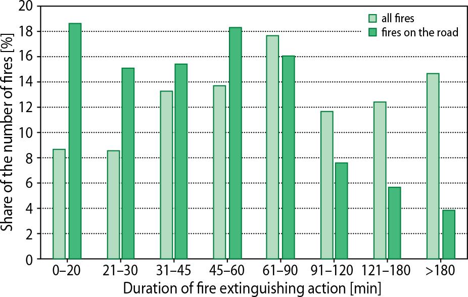 A significantly higher proportion of fires on public roads that were extinguished in a very short time (up to 45 min) was clearly visible. They accounted for almost half of the events analysed. For fires that took between 45 min and 1 h to extinguish, the proportion of fires on public roads was still higher compared to all fires, but the difference was already small. When the firefighting operation lasted longer, the proportion of fires on public roads was lower compared to all forest fires, and the difference became more pronounced as the duration of the firefighting operation increased (Fig. 5).