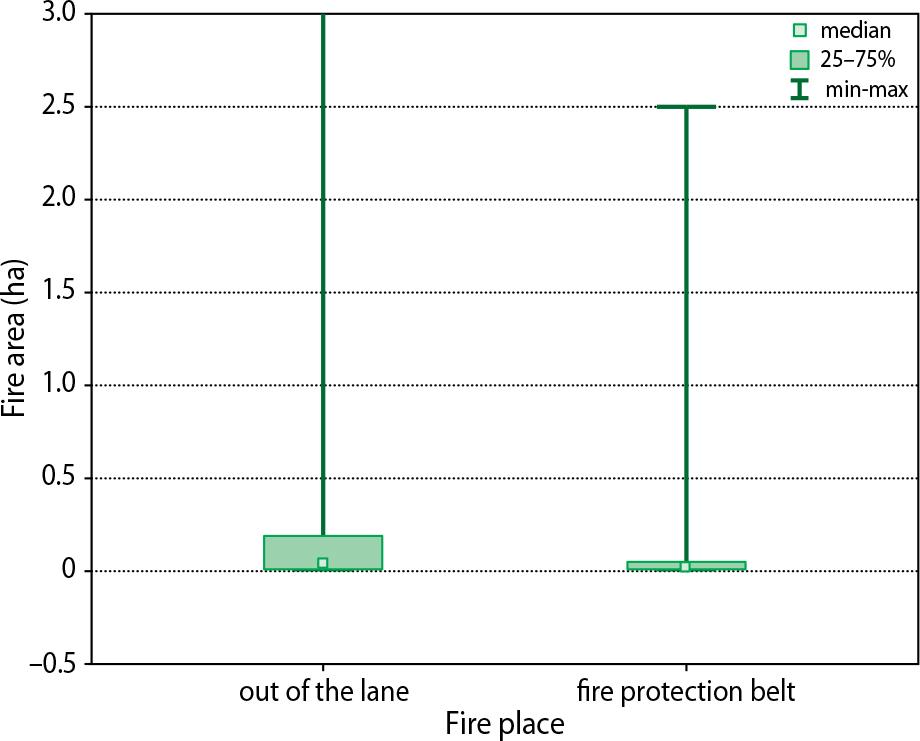 The next step was to determine whether a particular fire occurred on or off a fire break. This part of the work was carried out in the manner described in the methodology for analysing the occurrence of fires on public roads. For a more comprehensive assessment of the economic impact of fires, the size of fires and the losses they caused were compared for fires that occurred on roads and fires that occurred in other forests. This analysis included a comparison of the average values of the above parameters and an assessment of the significance of differences in the values of individual parameters depending on the location of the fire. The Mann–Whitney test was used to assess the significance of the differences.