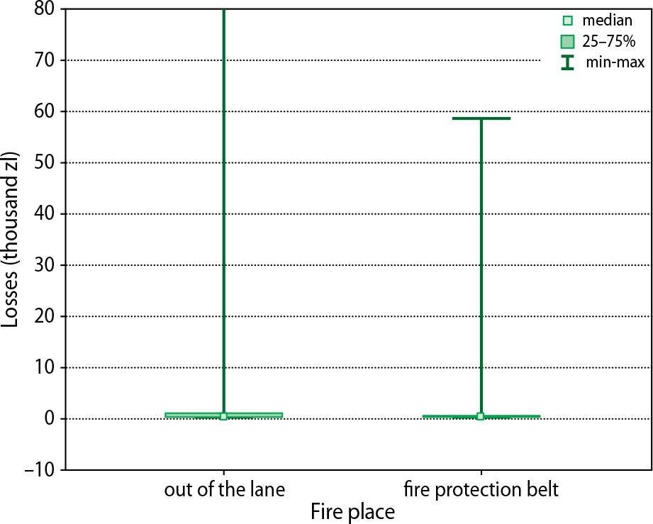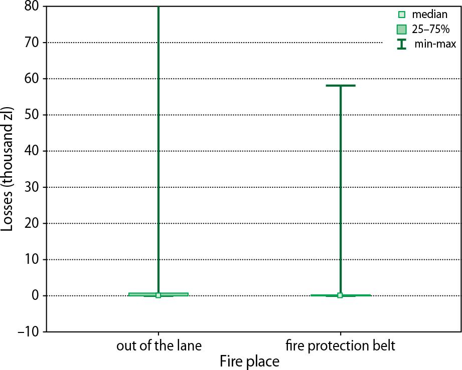 Losses totalled PLN 813,727.82 from road fires (annual average PLN 162,745) and PLN 26,213,778.82 in other forests (annual average PLN 5,242,755), which, taking into account the number of fires, amounts to PLN 605.45 for road fires and PLN 2,167.86 per fire in other forests. The losses caused by road fires account for only 3% of the total losses caused by forest fires. This means that the losses caused by road fires are on average more than 3.5 times smaller than the losses caused by other fires. Comparison of the rank sum, which was carried out using the Mann–Whitney test, provides a basis for the statement that the losses caused by forest fires depend significantly on the fire location, because the p-statistic value of this test, which results from the calculations, is 0.00, meaning that the differences are statistically significant at the assumed significance level of 0.05. Figure 8 shows the amount of losses caused by fire depending on the location of the fire, expressed as median, 25th and 75th percentiles. To improve readability, the scale of the Y-axis (fire area) in this graph has been adapted to the range of variation in the amount of damage caused by fires near roads. Of the fires that occurred outside the belts, only in 25 cases were the losses greater than PLN 80 thousand, which means that it was about 0.2% of the total number of fires that occurred there.