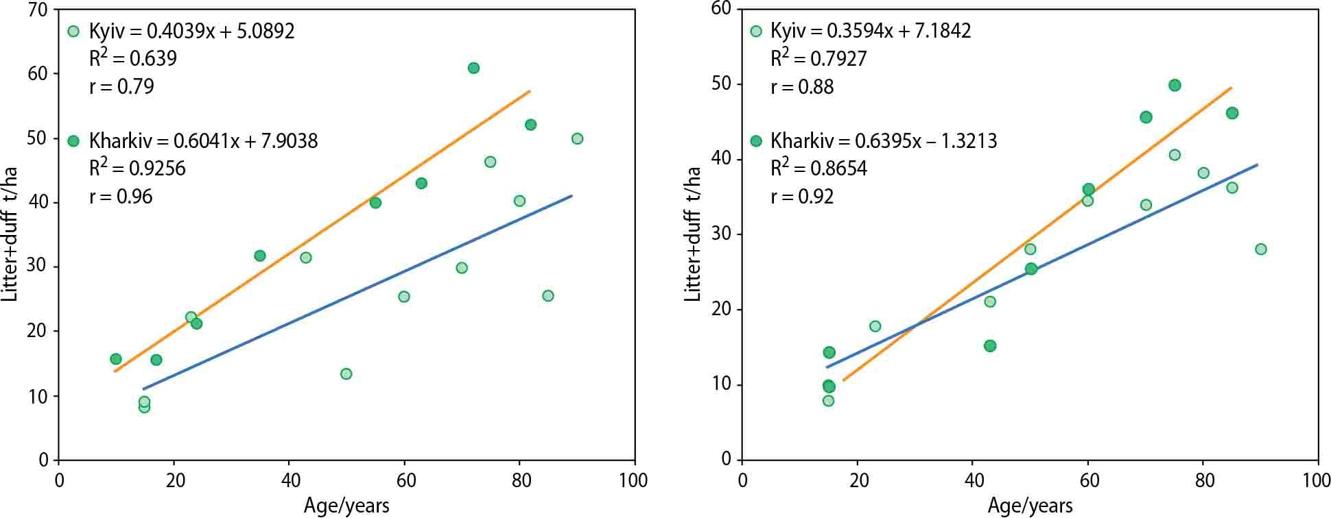 It was found that the forest litter load under the most common site conditions (B2–3), which dominate in the pine forests of both Kyiv and Kharkiv, ranged from 8.1 to 46.0 t/ha (absolutely dry weight) in the peri-urban forests of Kyiv, with the litter layer depth varying between 2.1 and 8.1 cm (Tab. 1). In contrast, substantially higher litter loads were observed in the green zone forests of Kharkiv, ranging from 15.6 t/ha in young pine stands to 60.0 t/ha in mature and overmature Pinus sylvestris stands (Fig. 1). The study revealed that litter accumulation increases with stand age (r = 0.65, p = 0.05) and is also positively correlated with key mensurational characteristics such as mean tree height (r = 0.77) and diameter (r = 0.61, p = 0.05).
