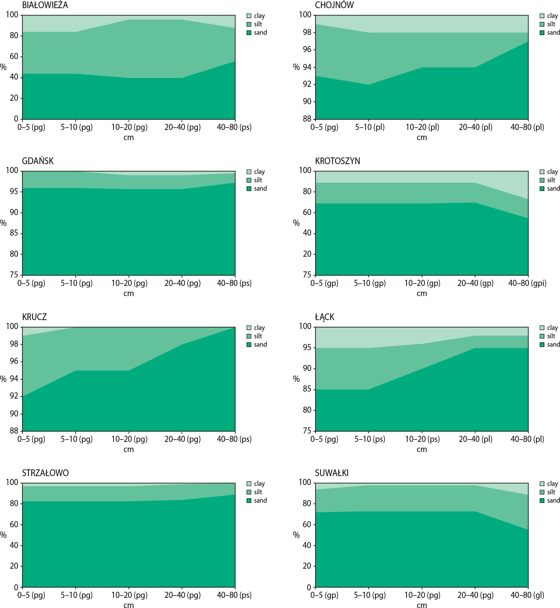 The soils on the plots were of varying composition. The majority of materials consisted of loamy sands (45% of cases, depending on depth), followed by a high proportion of sand (37.5%), sandy loam (15%) and sandy clay (2.5%). The vertical texture distribution of all plots is shown in Figure 2.