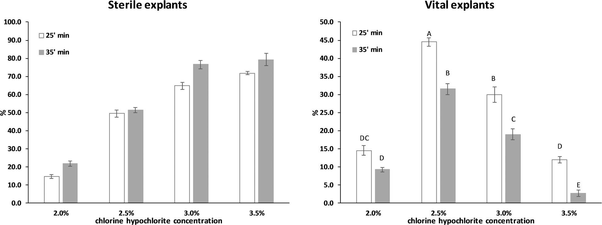 Percentage of sterile (left panel) and vital explants (right panel) of Cistus crispus at increasing sodium hypochlorite concentration (CHC) and time of sterilisation (TS). Data are values of mean ± standard error. For sterile explants, CHC: F = 31.2, p < 0.001; TS: F = 423.6, p < 0.001; and CHC × TS: F = 2.5, p = 0.088. For vital explants, CHC: F = 135.2, p < 0.001; TS: F = 276.7, p < 0.001; and CHC × TS: F = 4.0, p = 0.022. When CHC × TS was significant, treatments were separated by t-grouping of the LSMEANS estimate. Treatments with a letter in common are not different at t0.05-grouping.