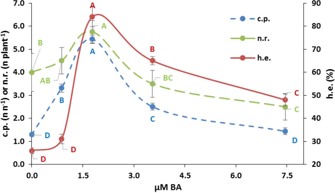 Coefficient of proliferation (c.p.), number of root (n.r.), and percentage of healthy explants (h.e.) of Cistus crispus cuttings at increasing benzylaminopurine (BA) concentration. Data are values of mean ± standard error. c.p.: F = 652.3, p < 0.001; n.r.: F = 15.1, p < 0.001; and h.e.: F = 314.3, p < 0.001. Within each variable, treatments with a letter in common are not different at p > 0.05 according to the Tukey's test applied to the LSMEANS estimates’ differences.