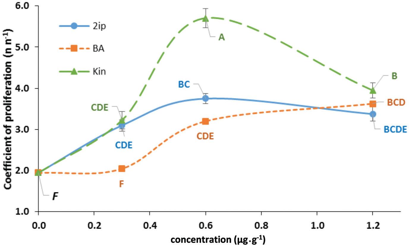 Coefficient of axillary shoot proliferation of Cistus crispus microcuttings at increasing concentration (CCYT) of cytokinins (CYTs): benzylaminopurine (BA), kinetin (Kin), or dimethylallylamino purine (2iP). Data are values of mean ± standard error. CYT: F = 67.3, p < 0.001; CCYT: F = 75.2, p < 0.001; and CCYT (CYT): F = 20.6, p < 0.001. DFnum and DFden of CCYT (CYT) were 4 and 27, respectively. Treatments with a letter in common are not different at p > 0.05 according to the Tukey's test applied to the LSMEANS estimates’ differences.