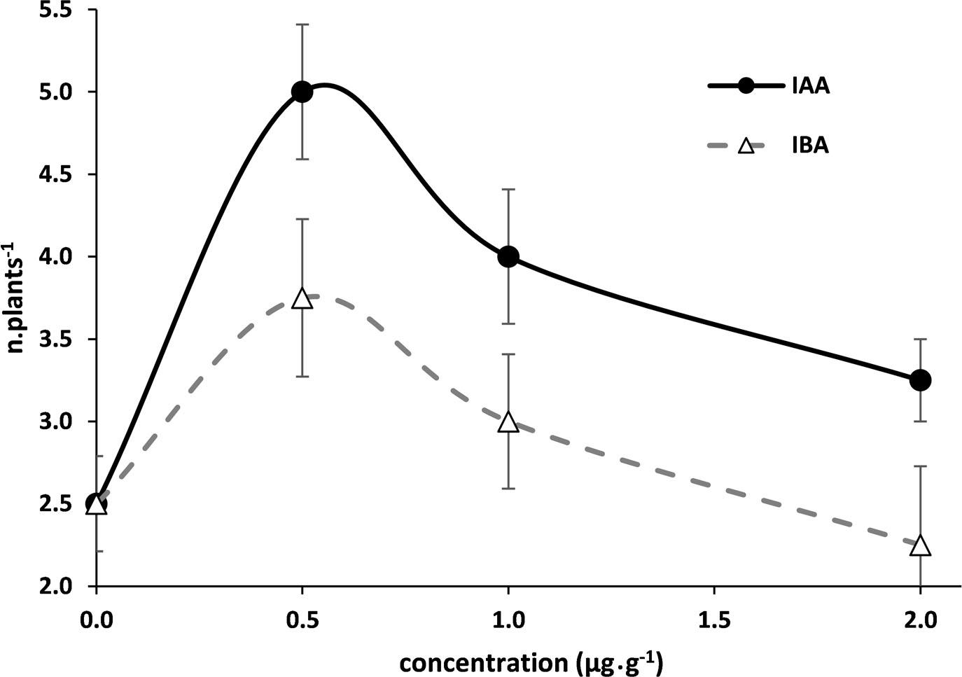 Root number of Cistus crispus microcuttings at increasing concentration (CAUX) of auxin (AUX): indole acetic acid (IAA) or indole butyric acid (IBA). Data are values of mean ± standard error. AUX: F = 11.4, p = 0.003; CAUX: F = 8.6, p = 0.002; CAUX (AUX): F = 0.007, p = 0.935. DFnum and DFden of CAUX (AUX) were 2 and 18, respectively.