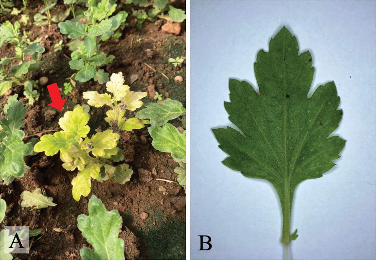 Symptoms observed on chrysanthemum leaves collected from Chiang Mai Province of Thailand that were positive to CVB detection by using RT-PCR. (A) Chlorosis and yellowing symptoms (the red arrow). (B) The mild mottling symptom. CVB, chrysanthemum virus B; RT-PCR; reverse transcription polymerase chain reaction.