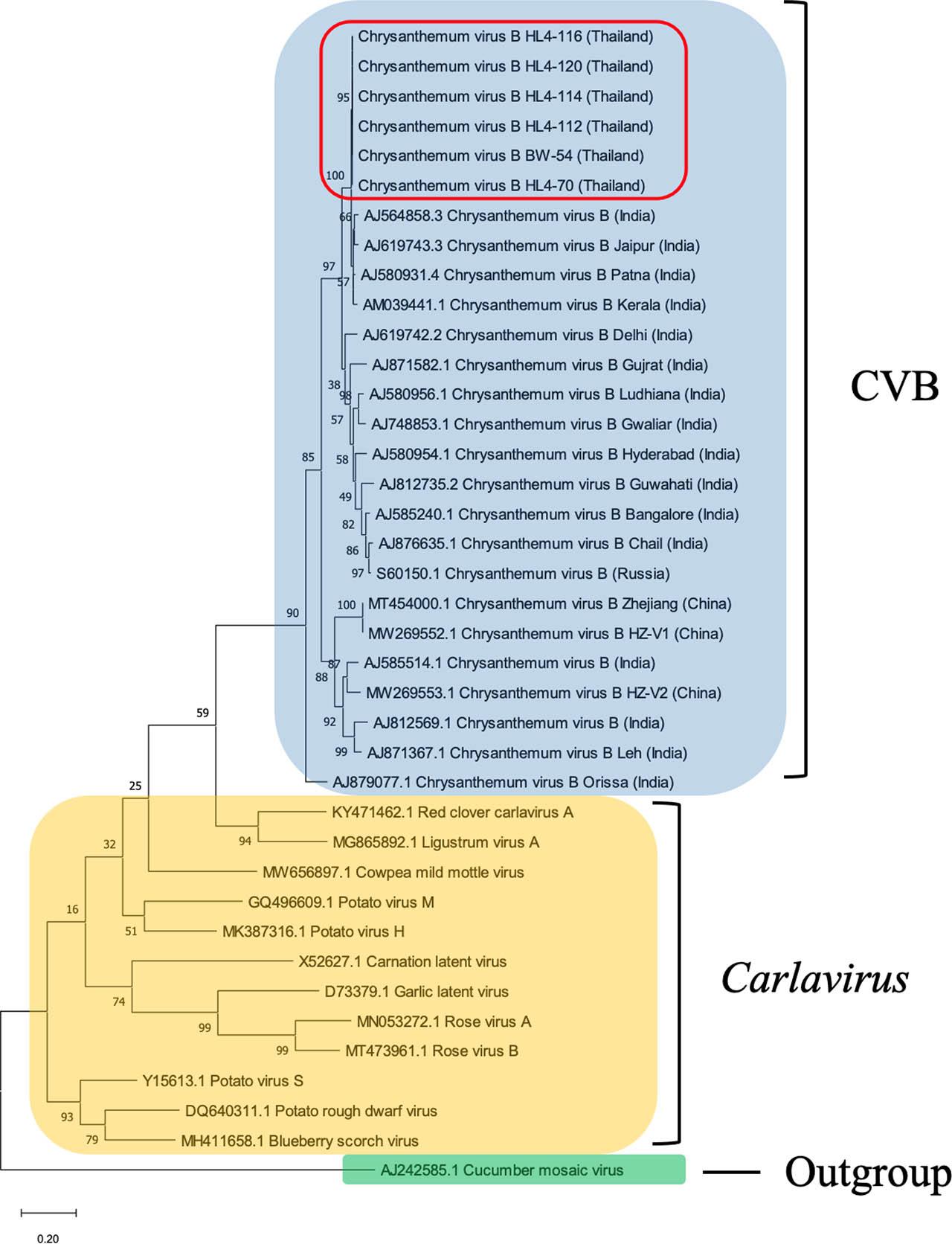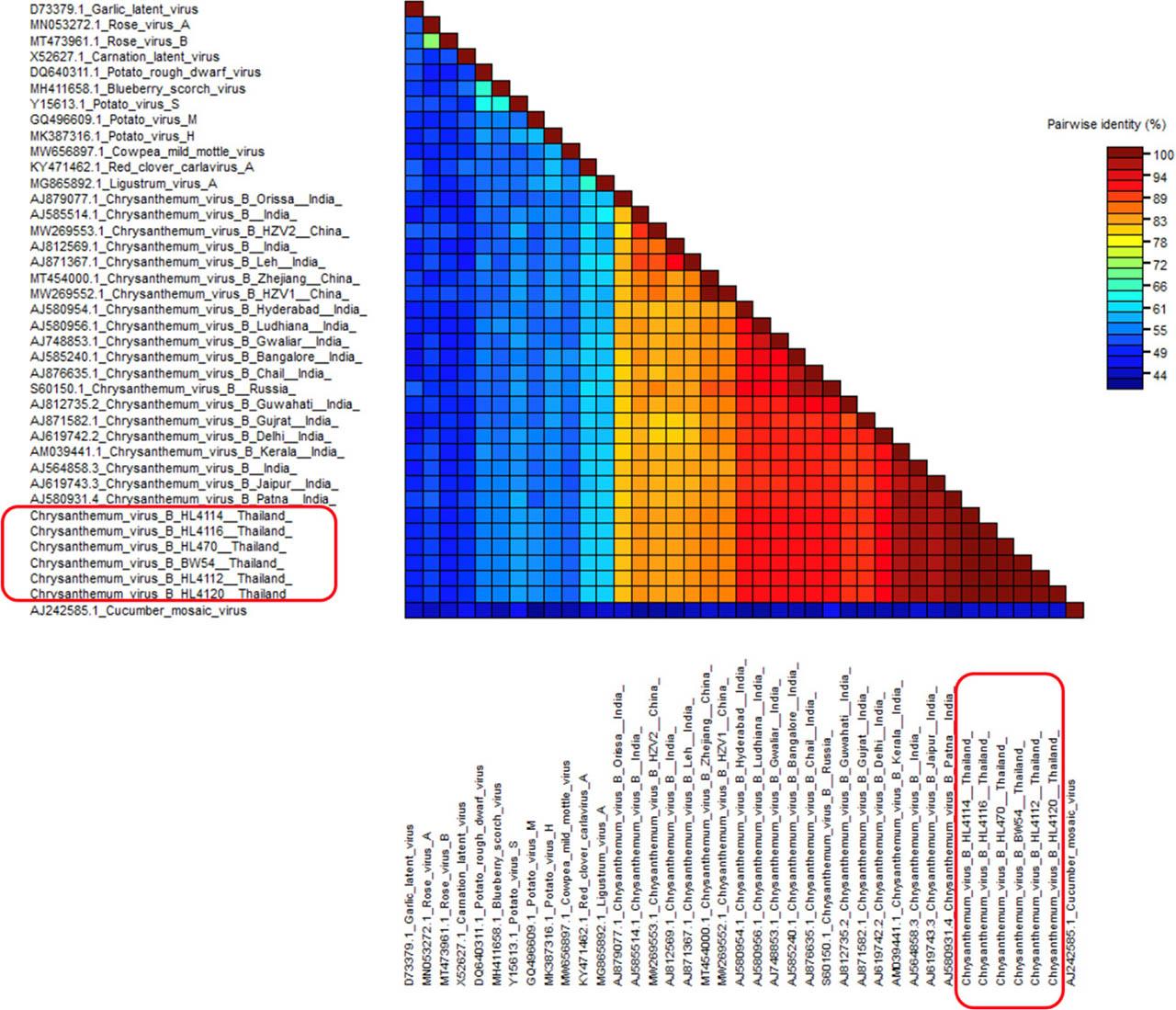 Colour-coded pairwise identity matrix generated from 35 virus sequences consisting of CVB isolates, other members of the genus Carlavirus and CMV of the genus Cucumovirus that was used as the outgroup. CVB isolates in this study were indicated by red boxes. The pairwise identity matrix was performed in the SDT version 1.2 program. The colour of the cell indicates the percentage identity score between two sequences (left and bottom axis) according to the colour-coded cells mean to each cell in the SDT matrix of the Figure 2. CMV, cucumber mosaic virus; CVB, chrysanthemum virus B; SDT, sequence demarcation tool.