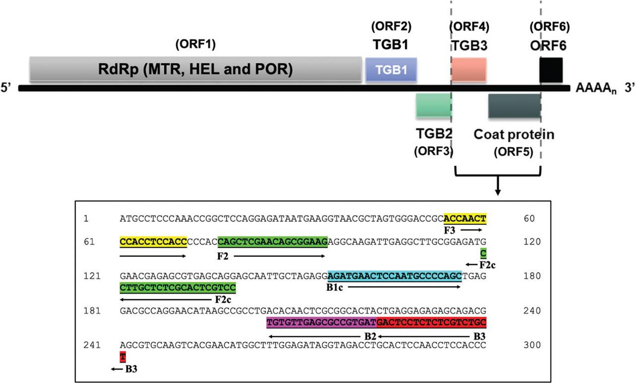 | LAMP | FIP* | CCTGCTCACGCTCTCGTTCCCAGCTCGAACAGCGGAAG | TGB3 + CP | 63–68 | This study |