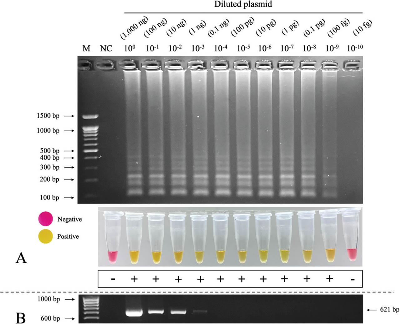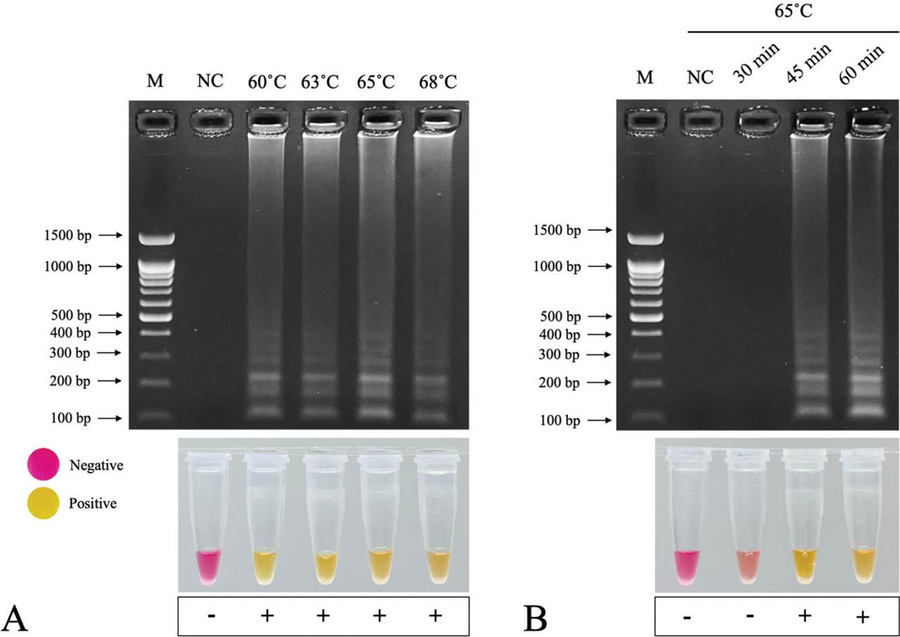 Colourimetric LAMP reaction was performed by using WarmStart® Colourimetric LAMP 2× Master Mix with uracil DNA glycosylase (UDG) (New England Biolabs, Ipswich, USA). A 25.0 μL aliquot of LAMP component was added to the 200 μL PCR tube containing 12.5 μL WarmStart® Colourimetric LAMP 2× Master Mix with UDG, 2.5 μL LAMP Primer Mix (10×), 1.0 μL of recombinant plasmid DNA and 9.0 μL of nuclease-free H2O. LAMP was performed at different incubation temperatures of 60 °C, 63 °C, 65 °C and 68 °C for 60 min to determine the optimal incubation temperature in terms of sensitivity. Subsequently, the incubation time was determined at the selected temperature for 30 min, 45 min and 60 min. The LAMP products were analysed using 1.5% AGE in 1× TBE buffer, and the gel was stained with RedSafe™ Nucleic Acid Staining Solution (iNiTron). Moreover, the results are colourimetric, whereby a change in the colour of the LAMP reaction after incubation from pink to yellow is considered a positive result, whereas a reaction that remains pink indicates a negative result.