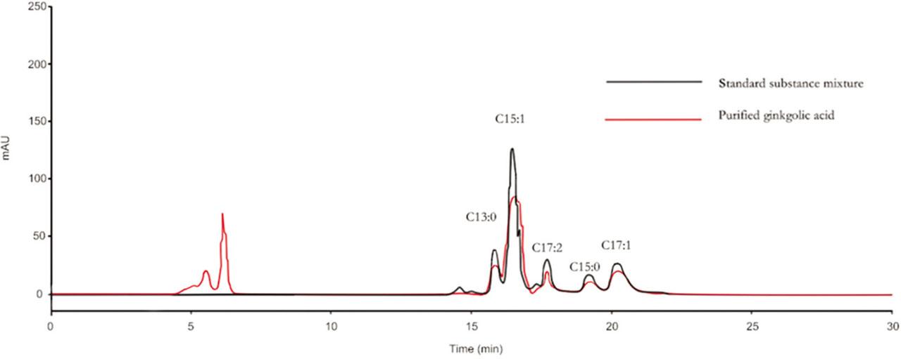 HPLC chromatogram of the standard substance mixture and purified ginkgolic acid. Standard samples are indicated by the black line and by the red line for purified ginkgolic acid by the red line. HPLC, high-performance liquid chromatography.