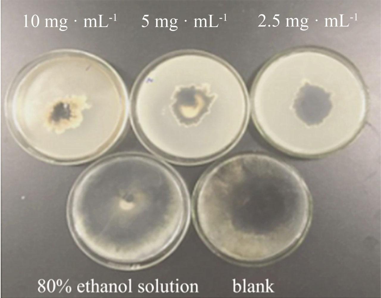 AB-8 macroporous resin has been widely used in the purification of active substances in plants due to its excellent selectivity in the adsorption of some weak polar organic molecules in the solution system (Gao et al., 2013; Zhao et al., 2013). Silica gel chromatography can separate substances according to their polarity and has been used in the isolation of a large number of compounds (Zhao et al., 2016). It has been reported that among the constituents in the alcohol extracts of the testa of G. biloba, the main weak polar compounds with bioactivity are ginkgolic acid, ginkgolic flavonoid and ginkgolide (Zhao, 2013; Wang and Zhang, 2019). Ginkgolides have no obvious inhibitory effect on fungi, and ginkgolic flavonoids can only inhibit the growth of fungi at a very high concentration (≥70 mg · mL-1); so they do not have an impact on this experiment (Fan, 2017).