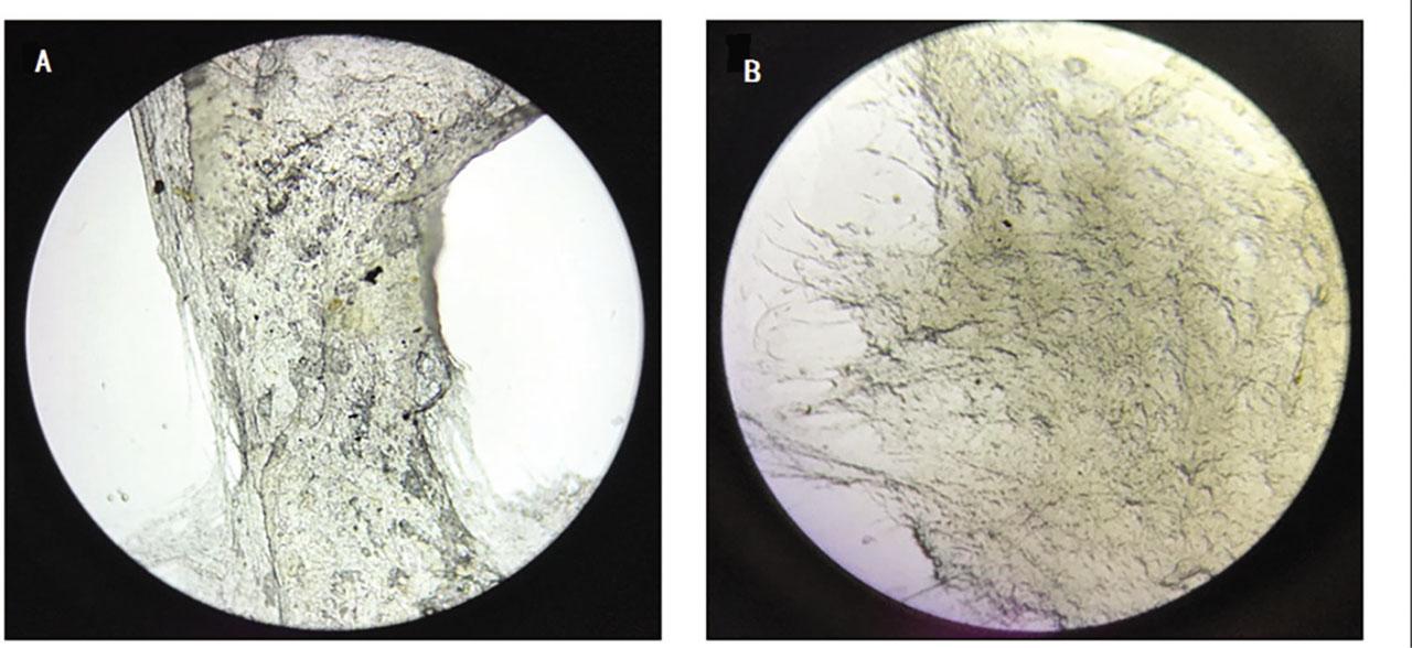 Optical microscopic images (10 × 40) of cell membranes of Nigrospora oryzae cultured (A) without and (B) with ginkgolic acid.