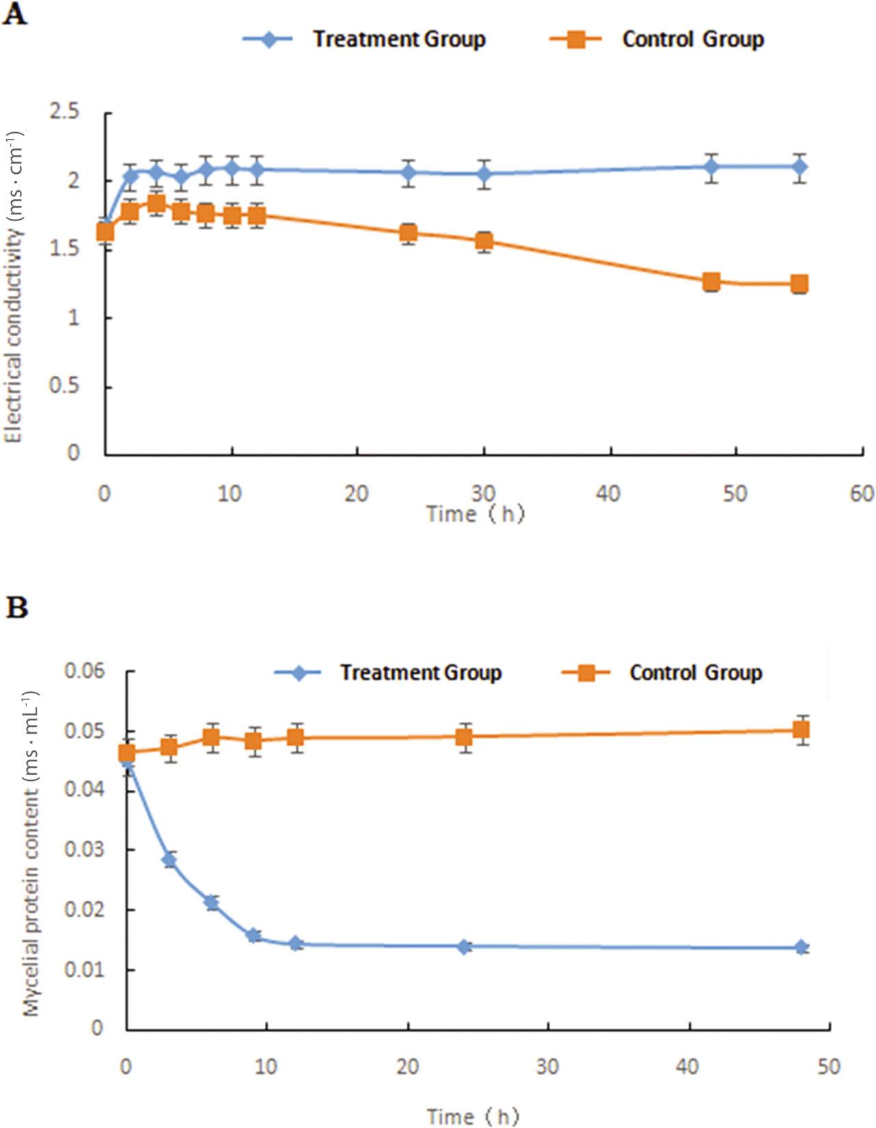 The extracellular conductivity was measured to evaluate the cell membrane permeability of N. oryzae. The effect of ginkgolic acid on the electrical conductivity of N. oryzae is shown in Figure 5A. After adding ginkgolic acid, the conductivity of the sample increased significantly between 0 h and 2 h, decreased slightly after 6 h and then stabilised at a high level. Electrical conductivity of the control group showed a general downward trend; although it rose during the period of 0–4 h and reached the peak at the fourth hour, it never exceeded that of the treatment group.