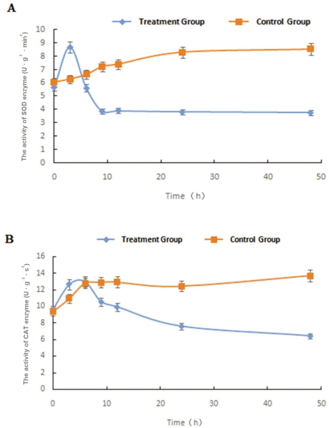 As shown in Figure 6A, the activity of SOD in the treatment group first rose sharply from 0 h to 3 h, then declined rapidly until 10 h and finally, it remained stable. In the control group, the overall trend of enzyme activity was up slightly. After treatment for 6 h, SOD activity in the treatment group was significantly lower than that in the control group.