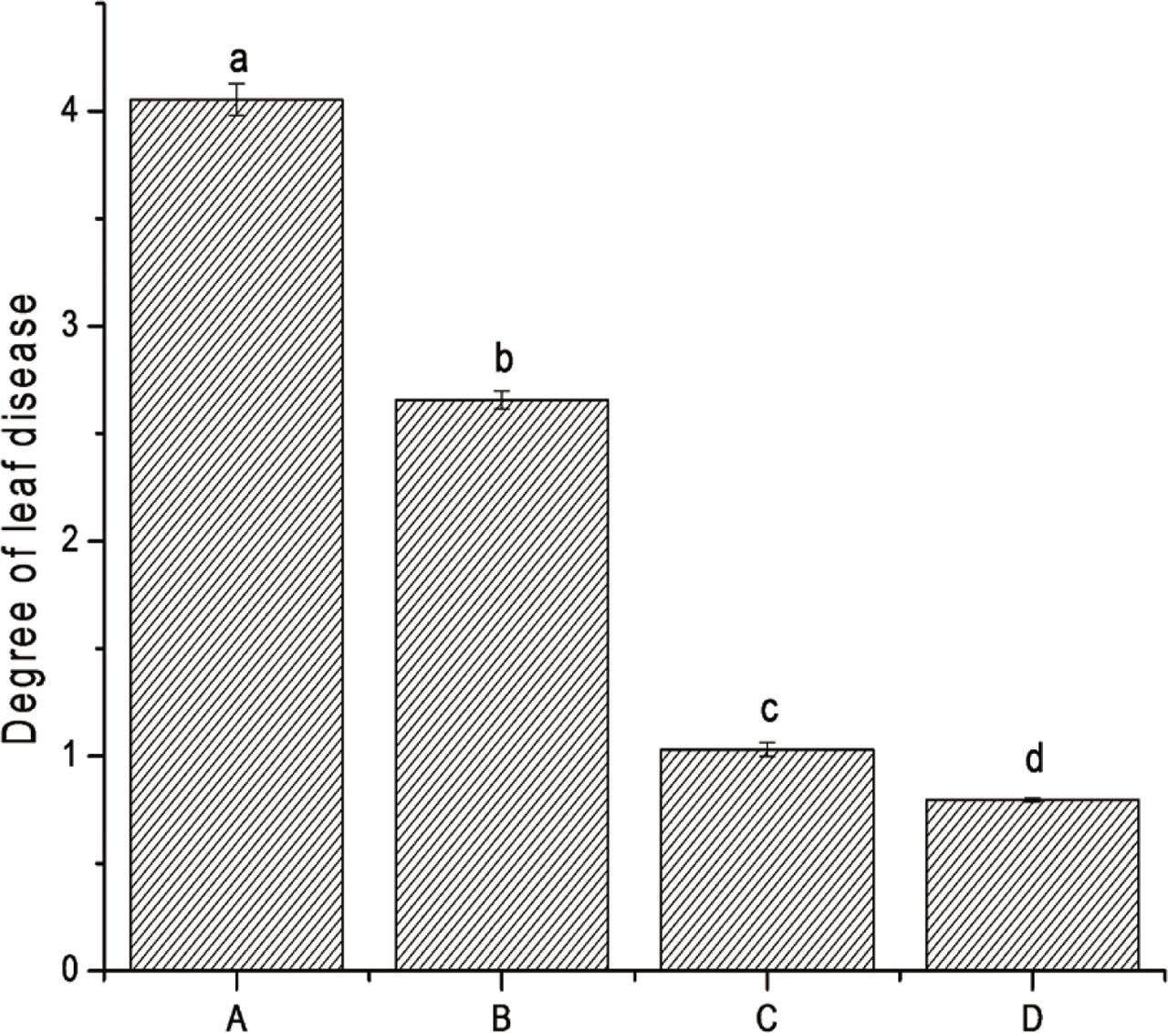 Degree of leaf disease: (A) treatment with sterile distilled water after Nigrospora oryzae inoculation; (B) treatment with ginkgolic acid after N. oryzae inoculation; (C) treatment with sterile distilled water after inoculation with sterile distilled water; (D) treatment with ginkgolic acid after inoculation with sterile distilled water. The concentration of spore suspension used for inoculation was 106 CFU · mL-1, and the concentration of ginkgolic acid was 5 mg · mL-1. CFU, colony-forming units.