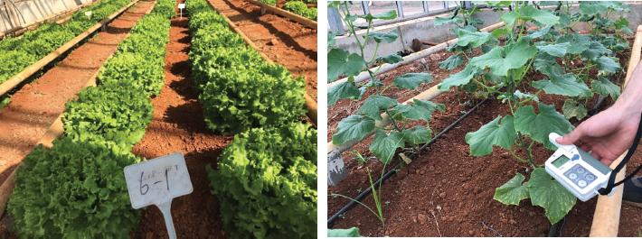 Before planting the lettuce and cucumber seedlings, a solution was prepared by mixing 1.5 L of the microbial fertiliser with 100 L of unchlorinated water. This solution was sprayed on the planting holes of seedlings, except for CF and control (C) applications. In addition to this, lettuce and cucumber seedlings (except C and CF) were dipped into a solution prepared by adding 750 mL of the microbial fertiliser to 100 L of unchlorinated water for 10 min before being planted into the soil. After planting the seedlings, the first irrigation was carried out straight away. After planting the seedlings, microbial fertiliser was applied to MF alone, CF + MF and 50% CF + MF at 15-day intervals, at a rate of 750 mL per 100 L. Microbial fertiliser application was continued till 1 week before the harvesting of lettuce and cucumber. Lettuce before harvesting and cucumber plants with chlorophyll measurement are shown in Figure 2.