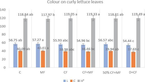 Effects of different applications on L, chroma (C) and hue (H°) angle values in curly lettuce leaves. The difference between values not shown with the same letter are significant at a p < 0.05 level. C, control; CF, chemical fertilisation; MF, microbial fertilisation; D, dipping.
