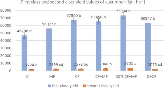 Both highest first-class and second-class yield values were obtained from 50% CF + MF application, where 50% less chemical fertiliser was applied with a microbial fertiliser. Accordingly, the highest first-class yield value was 73,304 kg · ha−1, and the highest second-class yield value was 3,701 kg · ha−1. Consequently, the highest value in terms of total yield was again achieved in the 50% CF + MF application. This was followed by CF, CF + MF and D + CF applications, respectively, with 67,360.1 kg · ha−1, 65,457.8 kg · ha−1 and 63,346.9 kg · ha−1, which were all in the same group in first-class yield. In the second-class yield, the second highest value was determined in CF + MF application with 2,947.5 kg · ha−1. The lowest first- and second-class yields were identified in C with 46,796.0 kg · ha−1 and 1,724.3 kg · ha−1, respectively. Because of the data obtained, it was seen that the microbial fertiliser was effective on the productivity of cucumbers. When comparing 50% CF + MF with CF at the recommended dose, 50% CF + MF increased first- and second-class yields by 8.11% and 30.33%, respectively. In addition, the total yield increased by 9.18%. With this application in cucumber, the highest yield was achieved and 50% fewer NPK fertilisers were used. The fact that the 50% CF + MF application provides the highest efficiency is of great importance in terms of saving expensive chemical fertiliser and reducing the negative effects of chemical fertiliser applications on soil fertility. It can also be noted that the use of microbial fertilisers has a positive effect on soil fertility in the long term.