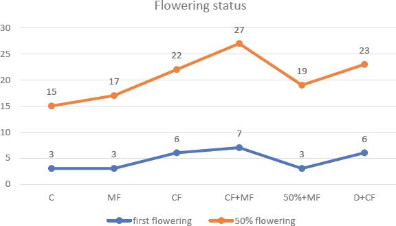 Earliness was determined by comparing the first female flower formations and the number of flowerings at the stage when 50% of the plants flowered in cucumber cultivation with microbial fertiliser (Figure 5). The highest number of female flowers in the first flowering was obtained from the CF + MF experiment. D + CF and alone CF treatments had an equal flower number. There was minimal and equal flower formation in C, MF alone and 50% CF + MF treatments. When 50% of the plants flowered, the highest number of female flowers was seen in CF + MF, and the least number of flowers was seen in C.