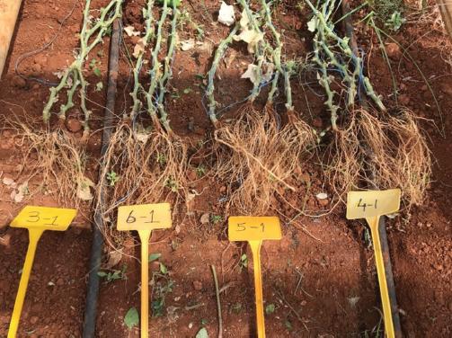 The roots in Figure 6 are the roots of cucumbers grown in CF (3-1), D + CF (6-1), 50% CF + MF (5-1) and CF + MF (4-1) experiments, respectively. During this research, no observation and measurement planning were made regarding the root since yield and quality criteria were considered. While the plants were removed manually from the field after the vegetation period, it was noticed that it was more difficult to remove the plant roots from the soil in 50% CF + MF application. Thereupon, the roots of the uprooted plants were examined, and as a result, it was observed that the roots of the plants belonging to 50% CF + MF application spread deeper and to the sides. The same application indicates that the earliness characteristics and yield values mentioned earlier are also related to root development.