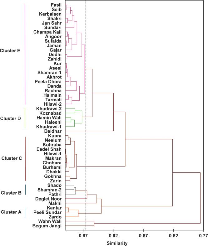 The Euclidean distance was applied to determine the genetic similarity/differences and relationship among collected genotypes of date palms (Figure 6). A dendrogram was constructed to cluster the studied genotypes into five different clusters (clusters A, B, C, D and E). However, five genotypes, namely, Begum Jangi, Wahn Wali, Makhi, Deglet Noor and Baidhar, did not cluster with other studied genotypes because of their higher dissimilarity and different genetic backgrounds.