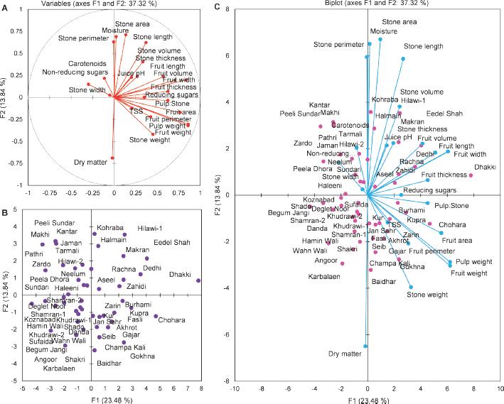 Variable plot (A), scatter plot (B) and biplot (C) analyses of physico-chemical characteristics of 50 date palm genotypes.