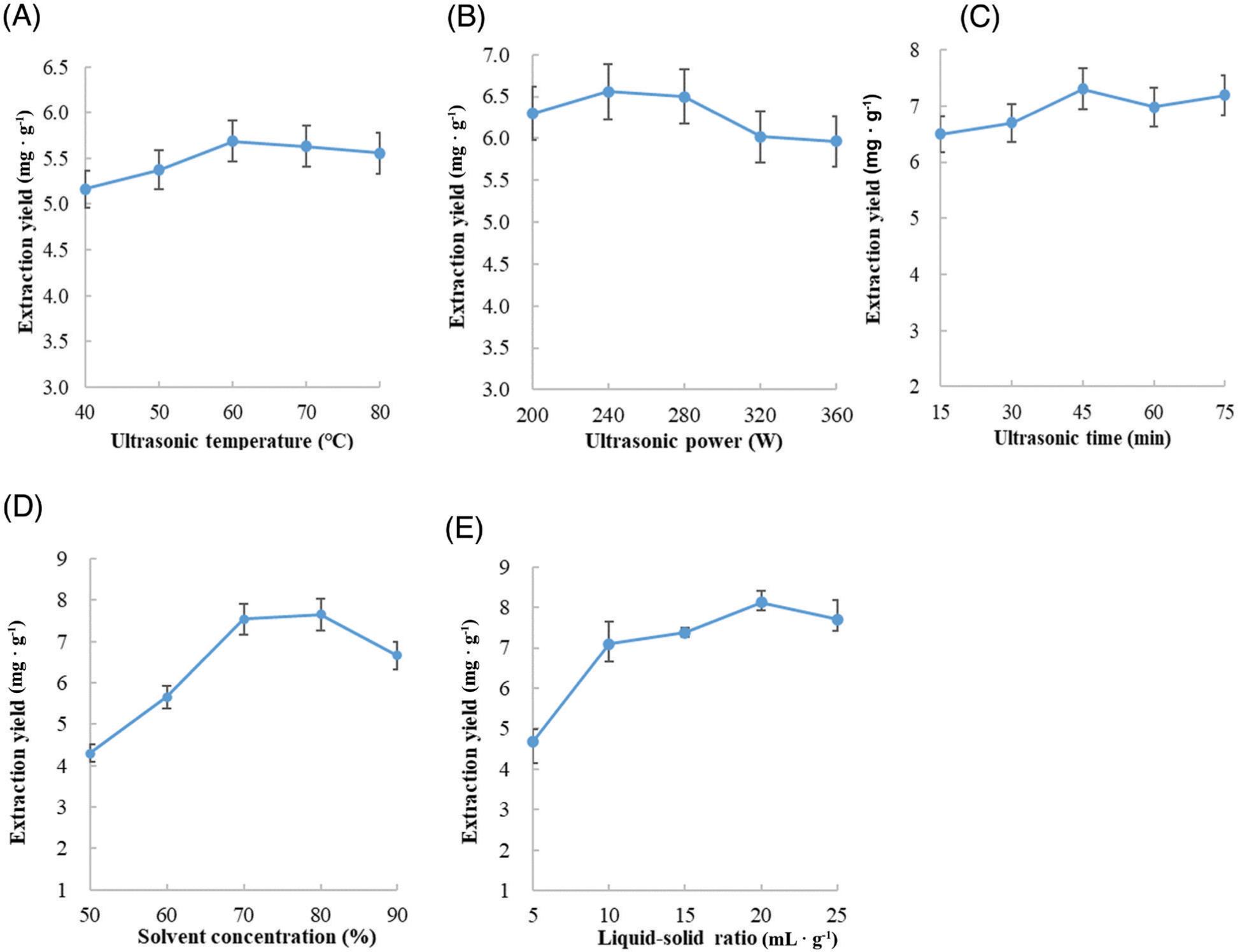 The effect of different ultrasonic temperature (A), ultrasonic power (B), ultrasonic time (C), solvent concentration (D) and liquid–solid ratio (E) on the extraction yield of MELTF.