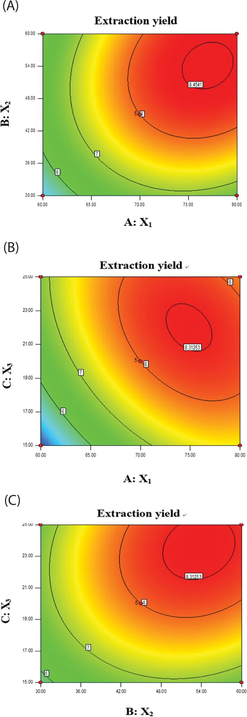 Contour plot showing the effect of solvent concentration and ultrasonic time (A), solvent concentration and liquid–solid ratio (B), and ultrasonic time and liquid–solid ratio (C) on extraction yield of MELTF.