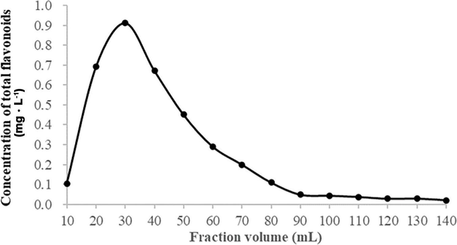 The collected 60% ethanol eluate was developed using the colour reaction with NaNO2-Al(NO3)3-NaOH to monitor the total flavonoid content. The elution profile was obtained based on the volume of elution and the concentration of solute therein and is given in Figure 4. It can be seen from Figure 4 that the total flavonoids were completely eluted by approximately 90 mL eluent at a flow rate of 1.5 BV · hr−1. So the elution volume of 60% ethanol is determined to be 1.5 BV. As compared to the purity of the unpurified total flavonoids (MELTF), the purity of the total flavonoids of M. exotica leaves after purification (MELPTF) by the macroporous resin was higher at 9.96%, which is nearly nine times higher than that of MELTF (1.26%).