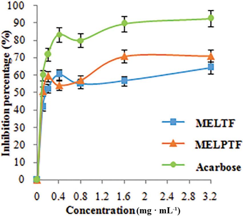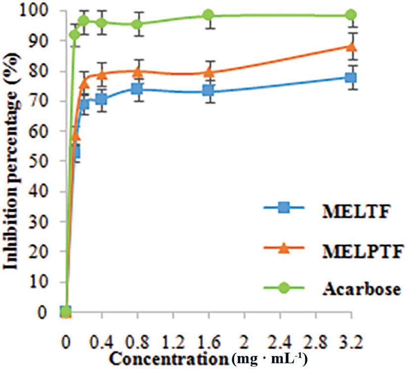 α-Glucosidase inhibitory activities of MELTF and MELPTF. MELTF, M. exotica leaves total flavonoids; MELPTF, MELTF after purification.